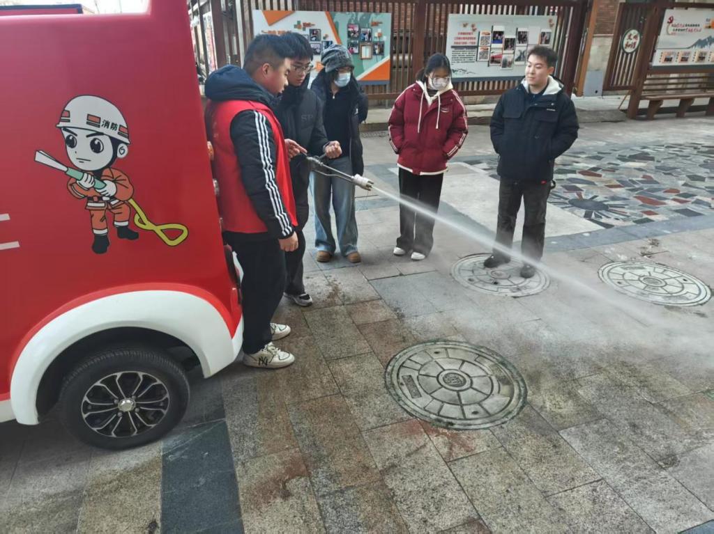 2024级机械设计制造及其自动化一班王梦宇同学在淮北市博庄社区社区负责人的带领下,参观了社区配备的先进消防器械,志愿者们在小区宣传栏张贴禁放烟花标语,他们向负责社区巡查的警务工作人员学习了相关政策与实施办法,进一步压实社区安全工作。