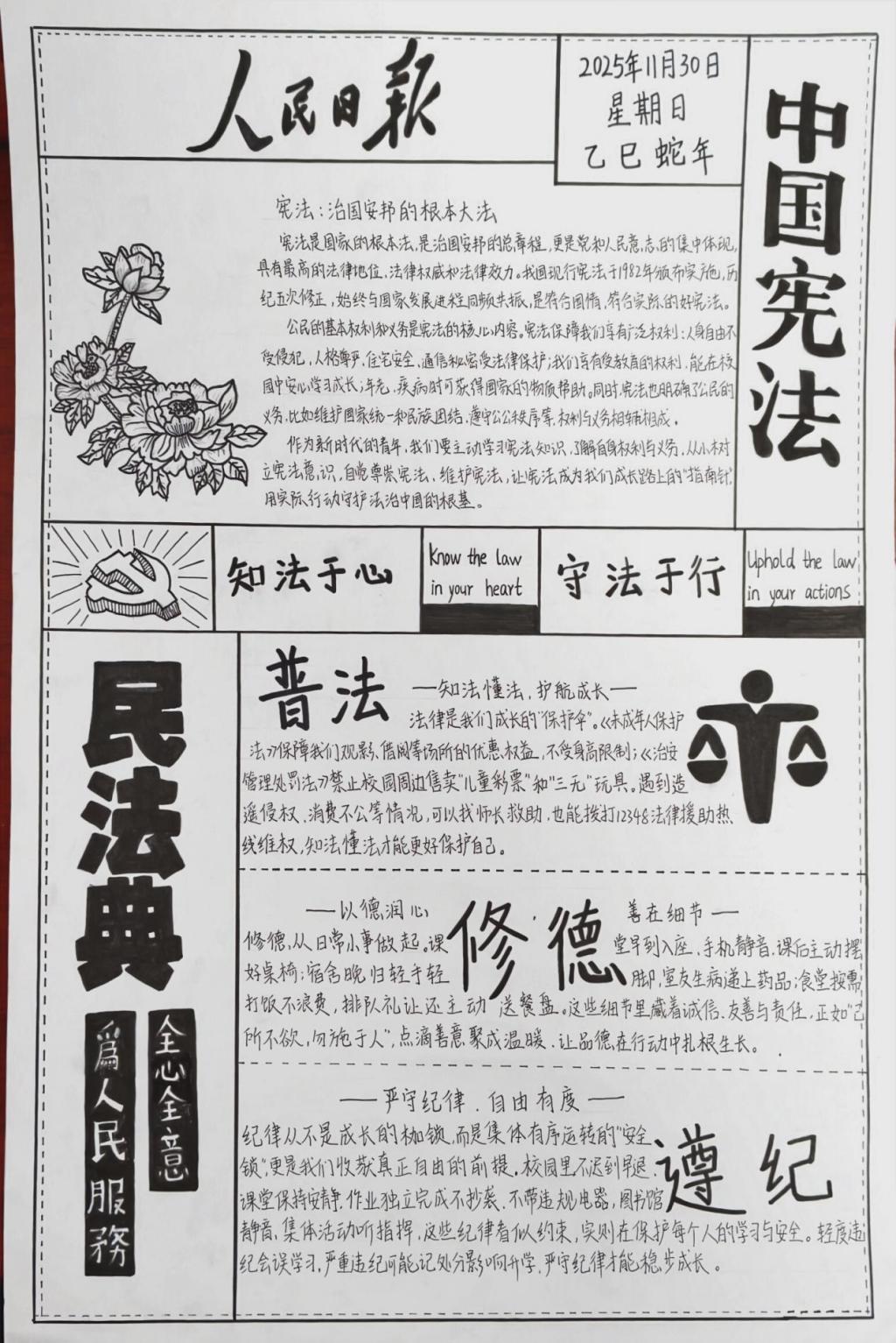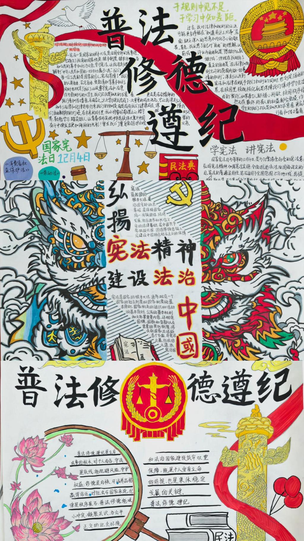 从作品内容来看,不少学子聚焦宪法这一根本大法,系统梳理其发展历程、核心内容与重要意义,明晰公民的权利与义务;在“修德”板块,大家将视角落于日常,从摆放桌椅、轻声晚归、帮扶室友、光盘行动等小事切入,诠释诚信友善的品德内核;而“遵纪”主题作品则清晰阐明纪律与自由的辩证关系,提醒同学们严守校园规章,规避违纪风险。部分学生还在作品中附上心得感悟,袒露对法治精神、道德准则的认知转变,彰显出活动对思想观念的深刻塑造。